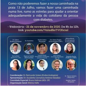 Mensagem do médico Raimundo Sotero: “Nossa comemoração do Novembro AZUL 2020,em meio a essa Pandemia será um evento 100% virtual. Uma manhã de sábado recheada de informações e troca de experiências…. não fique de fora…afinal, informação NUNCA é demais. Aguardo todos vocês” Sábado, dia 21 de novembro das 8h da manhã ao meio dia. Em: www.youtube.com/ValadaoTVOficial