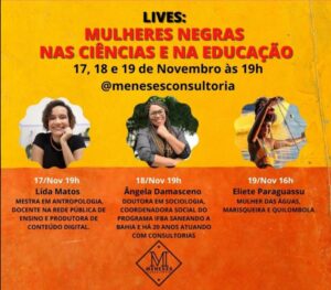 Lives Mulheres Negras na Academia e na Educação hoje, 18, e amanhã 19, às 19h Desde ontem, 17, a Meneses Consultoria vem realizando lives com um bate papo com mulheres negras, com suas histórias e vivências exemplares. Hoje, 18, às 19h, a live é com Ângela Damasceno, doutora em sociologia, coordenadora social do programa IFBA “Saneando a Bahia” e há 20 anos atuando com consultorias. Amanhã, 19, a live no mesmo horário, é com Eliete Paraguassu, mulher das águas, marisqueira e quilombola. Venha conhecer e participar destes encontros memoráveis, trocar ideias e afetos conosco. As lives acontecerão na página do Instagram: https://www.instagram.com/menesesconsultoria/