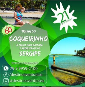 Coqueirinho: A trilha mais gostosa e refrescante de Sergipe! Saída dia 21 de novembro de 2020 às 7h (sábado)/Retorno dia 21 de novembro de 2020 ás 18h30 (sábado). Saída do estacionamento do Teatro Tobias Barreto (D.I.A.) Nível da trilha: Leve/Média (Escala de 1 a 10, 7,0) 10km. Pacote Inclui: Ônibus executivo c/ banheiro;Trilha (guiamento);Acompanhamento fotográfico. Investimento: Após 17/11/2020/R$ 65,00 a vista ou 2x nos cartões de R$ 34,99. Não trabalhamos com o Banese Card. Informações e Reservas Alex Moura Tel ( 079 ) 9.9959-2100 WhatsApp /E-mail: destinoaventura.se@gmail.com Redes sociais: www.facebook.com/destinoaventurase/ ou https://www.instagram.com/destinoaventurase/