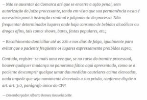 precisam fazer as partes deles. Galeguinho já ameaçou radialistas que prestaram BO e no final do ano passado por muito pouco não matou o próprio irmão. Foi preso e depois teve a prisão revogada por conta do desembargador Alberto Romeu Gouveia Leite que quando juiz já atou em Itabaiana e por conhecer o meliante não deveria deixa-lo solto. E um detalhe: Galeguinho está transitando em todos os locais e não está se recolhendo às 22h como o desembargador deixou claro na decisão de soltura (print ao lado). Ou seja, era para ele retornar a prisão, porém o padrinho não deixa.
