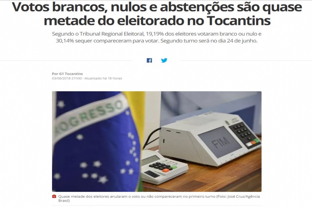 Além do percentual de votos brancos, nulos e abstenções chegar a quase 50% em todo o Tocantins, em 11 cidades do Estado este número (brancos, nulos e abstenções) superou a quantidade de votos válidos. Ou seja, a omissão significativa do eleitorado faz com que sejam eleitos políticos que não tenham a maior representatividade.