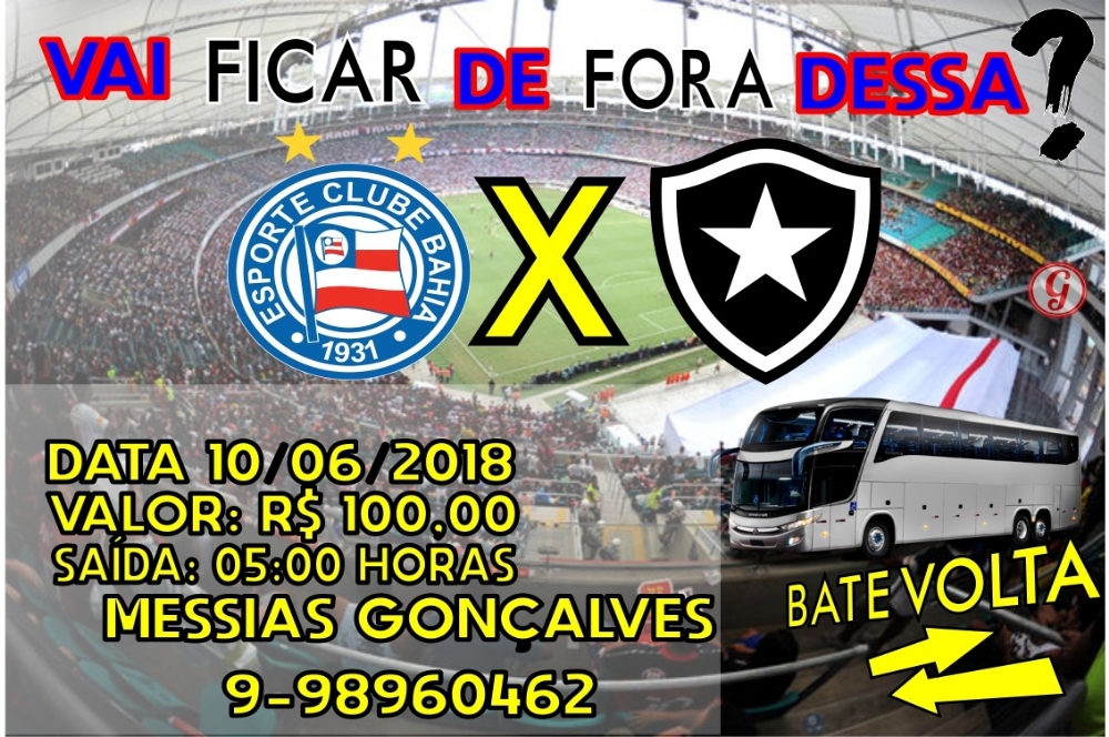 | Atenção BOTAFOGUENSE, só restam 05 vagas para o BATE VOLTA ARACAJU SALVADOR, domingo dia 10 de junho, saindo 05:00 horas para assistir BAHIA X BOTAFOGO. Ao chegar em Salvador, iremos direto para o hotel que o glorioso estará hospedado, para registrar a torcida de Sergipe, para a CONSTELAÇÃO ALVINEGRA. Últimas vagas, Messias, 998960462 |