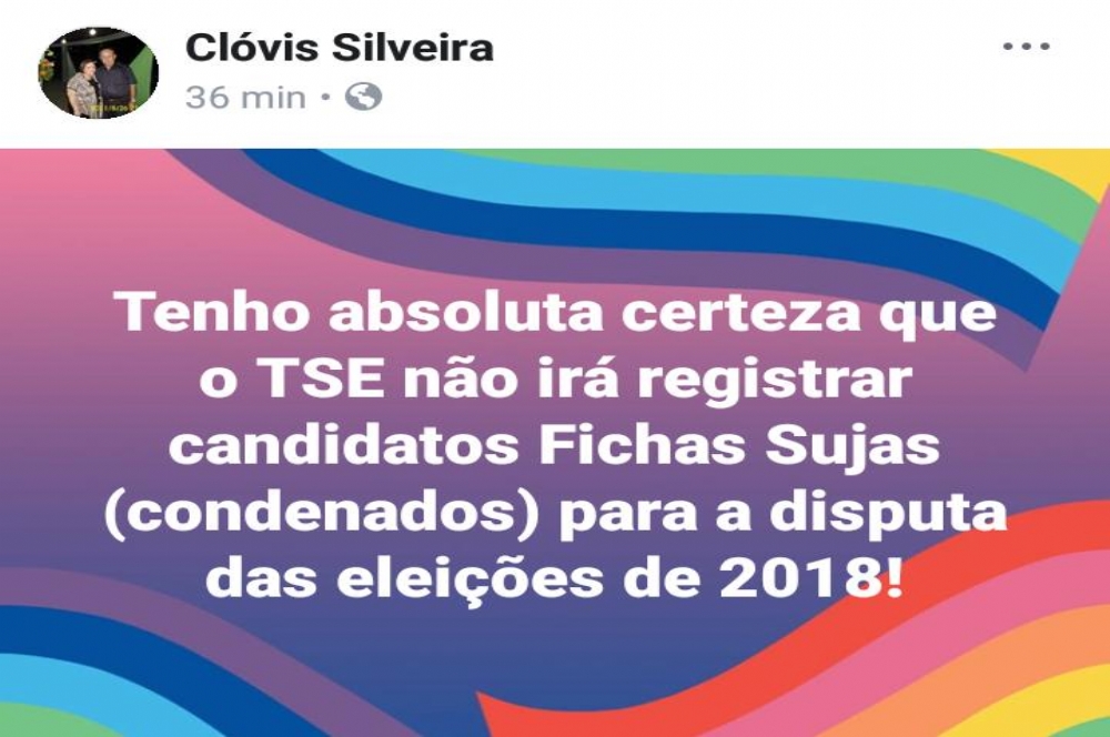 Pelas redes sociais presidente do PPS avalia que TSE não irá registrar candidatos fichas sujas Pelo zap: “Levando em consideração essa postagem do presidente do PPS, podemos presumir que o partido presidido por Clóvis não irá votar na pré-“candidatura de André Moura ao senado? Lembrando que o PPS declarou apoio ao PSC de André Moura e do PSDB de Eduardo Amorim. E aí Clóvis como fica?”