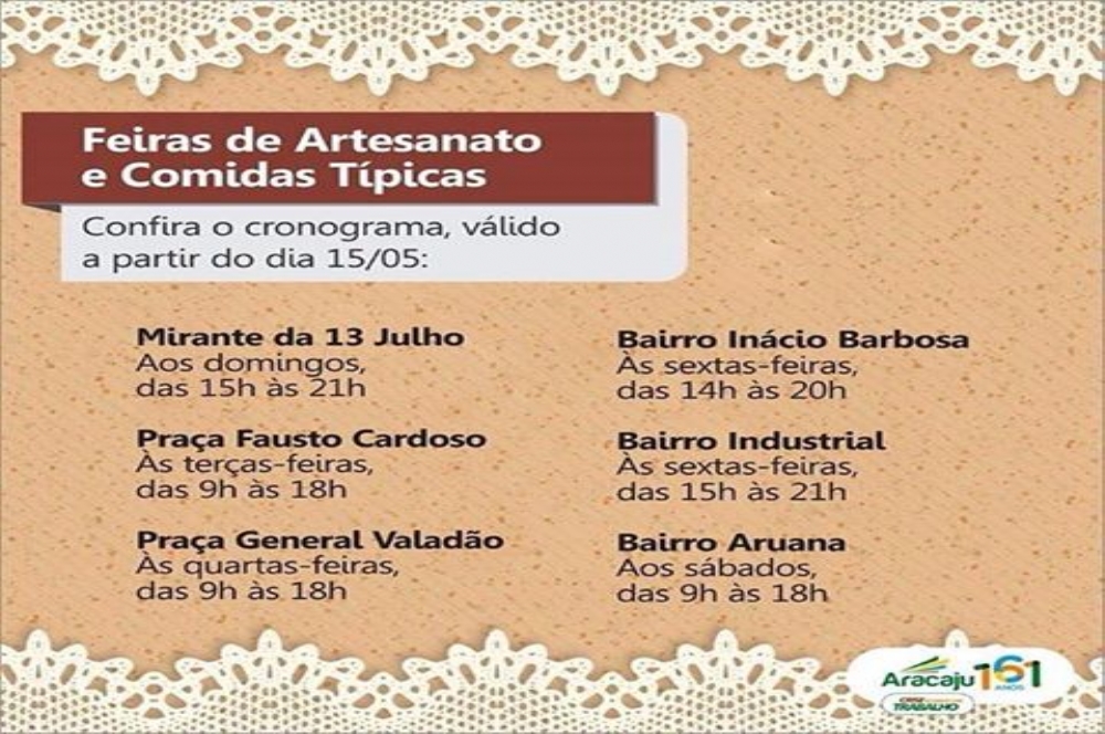 No dia 15 de maio, iniciou-se na capital sergipana as Feiras de Artesanato e Comidas Típicas nos bairros. A cada dia o turista poderá ir a um local, conforme uma programação pré-selecionada de acordo com o interesse turístico da localidade e vocação dos moradores. Ponto positivo.
