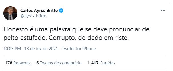 www.twitter.com/ayres_britto Honesto é uma palavra que se deve pronunciar de peito estufado. Corrupto, de dedo em riste.