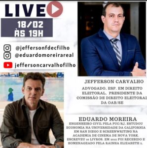 às 19h, uma live com uma mente brilhante do Brasil, Eduardo Moreira, engenheiro civil pela PUC/RJ; estudou economia na Universidade da Califórnia em San Diego e Screenwriting (roteiro) na Academia de Cinema de Nova York; escreveu 10 livros e em 2012 foi recebido e homenageado pela Rainha Elizabeth II. Eduardo Moreira vem se destacando na participação deste tipo de debate, conversando com outros expoentes do Brasil, principalmente no campo mais progressista. A live será coordenada por Jefferson Carvalho, advogado especialista em direito eleitoral e presidente da Comissão Eleitoral da OAB/SE. Vale à pena acompanhar: https://www.instagram.com/jeffersonfdecfilho/ ; https://www.instagram.com/eduardomoreirareal/ e do canal do YouTube Jefferson Carvalho Filho.