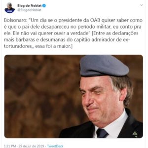 www.twitter.com/BlogdoNoblat Bolsonaro: “Um dia se o presidente da OAB quiser saber como é que o pai dele desapareceu no período militar, eu conto pra ele. Ele não vai querer ouvir a verdade” [Entre as declarações mais bárbaras e desumanas do capitão admirador de ex-torturadores,, essa foi a maior.