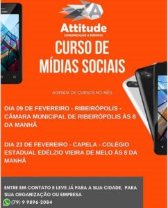 O Curso Livre de Mídias Sociais realizado pela Attitude Comunicação & Eventos está chegando a todos os cantos de Sergipe. No próximo dia 09, sábado será a vez do município de Ribeirópolis com o curso a partir das 8h, no plenário da Câmara Municipal. Já no dia 23 de fevereiro será a vez do município de Capela no Colégio Estadual Edésio Vieira de Melo a partir das 8h. Quem desejar levar o curso para sua cidade é só entrar em contato pelo celular: (79) 99896 – 2084.