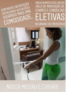 Pelo zap: “Para facilitar ainda mais a assistência aos nossos clientes atendidos na nossa Emergência 24h, após serem atendidos, caso necessitem marcar exames eventualmente solicitados ou consultas de forma eletiva, terão imediatamente às suas disposições uma sala voltada de forma exclusive para esta prestação de serviço.”