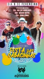 Segredo, em Aquidabã, estará realizando mais uma edição da Festa das Cabacinhas. É uma festa tradicional que já faz parte do calendário Cultural do município a mais de 50 anos. Durante o dia há guerra de Cabacinhas e à noite shows com Ago das Vaquejadas, Banana Nativa e Danielzinho. A organização fica a cargo da Prefeitura Municipal de Aquidabã, vereadora Tânia de Valter, Tindo da Rifa e Washington. Compareça para conhecer a tradição.
