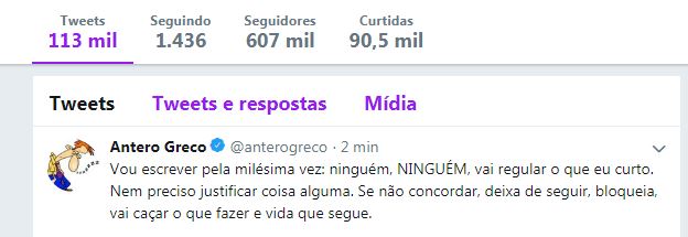 www.twitter.com/anterogreco Vou escrever pela milésima vez: ninguém, NINGUÉM, vai regular o que eu curto. Nem preciso justificar coisa alguma. Se não concordar, deixa de seguir, bloqueia, vai caçar o que fazer e vida que segue.