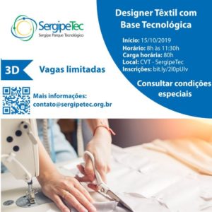 outubro a 13 de novembro De 15 de outubro a 13 de novembro, o Sergipe Parque Tecnológico vai realizar o curso de Designer Têxtil com Base Tecnológica. Com o objetivo de constituir a relevância das funções do diagrama e medidas na modelagem plana, tendo como perspectiva a produção de peças na confecção básica, o curso é aberto a estudantes e profissionais (a partir dos 18 anos, e não precisa ter conhecimento prévio sobre o conteúdo), além de instituições e indústrias atuantes no segmento.