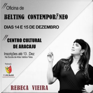 Belting Conteporâneo No próximo sábado e domingo (dias 14 e 15) a cantora Rebeca Vieira estará promovendo pela primeira vez uma oficina de Belting Conteporâneo no Teatro João Costa no Centro Cultural de Aracaju. Belting Contemporâneo é uma técnica vocal que vai revolucionar a forma de cantar. As inscrições estão abertas até o dia 13 (sexta-feira) na Escola de Artes Valdice Teles. Horário das oficinas: Dia 14 – das 13:00 hs às 18:00 hs.Dia 15 – das 09:00 hs às 17:00 hs.