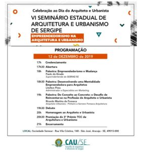 Realização O VI Seminário Estadual de Arquitetura e Urbanismo é uma realização do Conselho de Arquitetura e Urbanismo de Sergipe, que contém em sua programação o 3º Prêmio de Trabalho de Conclusão de Curso (TCC)de Arquitetura e Urbanismo de Sergipe – elaborado juntamente com o Instituto de Arquitetos do Brasil, seccional Sergipe (IAB/SE) – além da comemorar o Dia do Arquiteto e Urbanista, celebrado em 15 de dezembro.