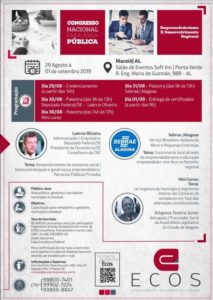 Administração Pública: de 29 de agosto a 01 de setembro A Ecos – Consultoria, treinamento e cursos realizará de 29 de agosto a 01 de setembro em Maceió (AL), no salão de eventos do Soft Inn, um Congresso Nacional para a área pública, voltado para o empreendedorismo e desenvolvimento regional. Entre os palestrantes técnicos do Sebrae/AL e o presidente da Fecomércio/SE, deputado federal Laércio Oliveira. O evento terá também um mini-curso sobre as alterações constitucionais e o regimento interno das câmaras municipais e a lei orgânica dos municípios.
