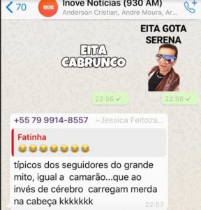 Pirambu: auxiliar do grupo de André Moura detona Bolsonaro De um dos participantes do grupo: “Você viu Cláudio Nunes a repercussão do que a secretária de comunicação de Pirambu, Jessica Feitosa colocou no grupo Inove Notícias? Chamando Bolsonaro de camarão? Será que o prefeito Elio Martins o vice Guilherme Melo e o ex-deputado André Moura são Camarões porque apoiam o presidente?”