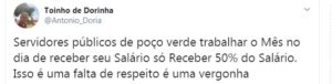 Dorinha postou ontem no twitter: “”A Nova moda do prefeito de poço verde pagar os Servidores 50% do salário Do Mês trabalhado.” Interessante, o pior que o sindicato lá está calado mesmo com a falta de reajuste, o parcelamento salarial e a falta de condições de trabalho. Estão calados os sindicalistas…