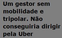 A constatação do cidadão que iria investir no Reino do “Tudo pode”: um gestor que não tem ideias e mobilidade nem mesmo para dirigir pela Uber. Com todo respeito aos motoristas do aplicativo.