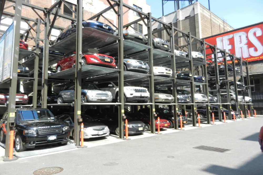 | Um pequeno estacionamento matricial de automóveis que visitei em Nova York, dotado de engrenagens elevatórias, transversais e longitudinais, o suficiente para estocagem de quase cem carros, podendo tal número ser expandido como os elementos de qualquer matriz tridimensional. |