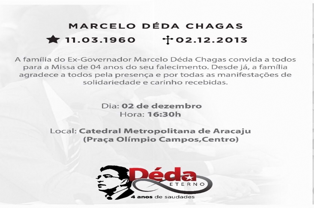 E em época de tantos escândalos, descaminhos, ódio e dúvidas, o nome Marcelo Déda é um legado de esperança de que o mundo pode ser o espaço da confiança e da generosidade humana; da comunhão e da solidariedade. Com Déda, palavras se transformavam em esperança e números em gente. Déda via no povo sua razão para a atividade política, que ele tanto honrou e tantos exemplos deixou.