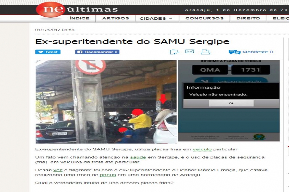Ex-superitendente do SAMU Sergipe, utiliza placas frias em veículo particular Deu No NeNoticias: “Um fato vem chamando atenção na saúde em Sergipe, é o uso de placas de segurança (fria) em veículos da frota até particular.Dessa vez o flagrante foi com o ex-Superintendente o Senhor Márcio França, que estava realizando uma troca de pneus em uma borracharia de Aracaju.Qual o verdadeiro intuito de uso dessas placas frias?”