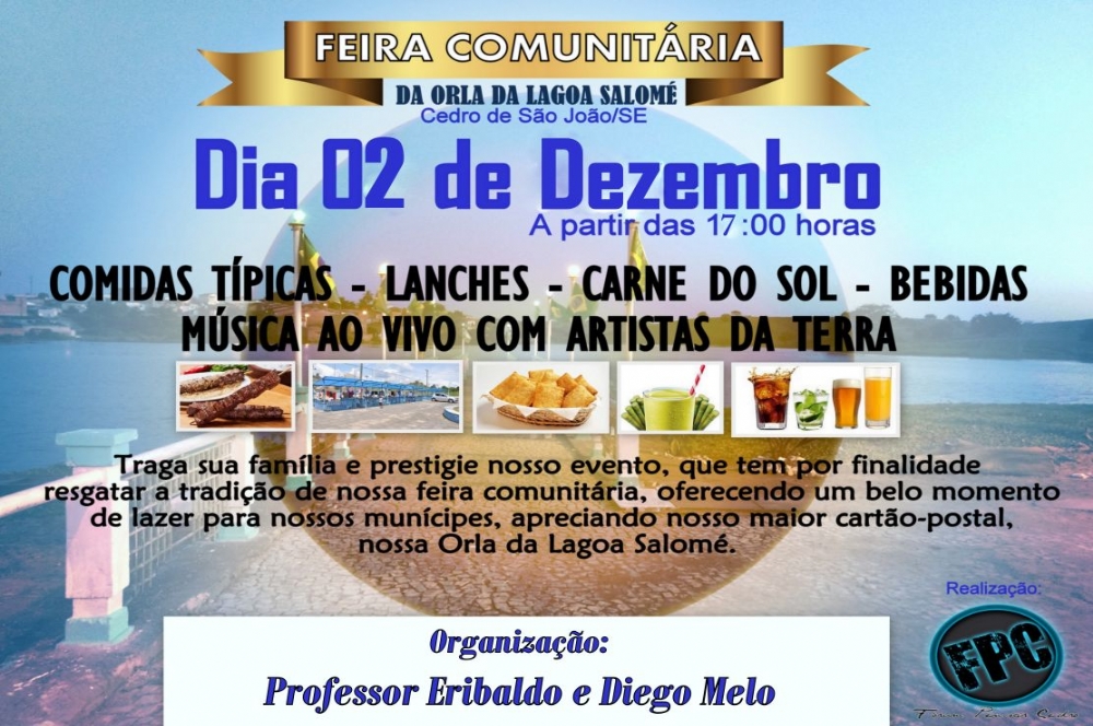 Cedro de São João: É hoje, 02, Feira Comunitária da Orla da Lagoa Salomé Numa organização do professor Eribaldo e Diego Melo será realizada hoje, 02, a partir das 17h, a Feira Comunitária da Orla da Lagoa Salomé. No Barzinho da Orla será realizado um show ao vivo com Tony Rocha, lançando seu mais novo Cd, e Keké. A feira também tem comidas típicas.