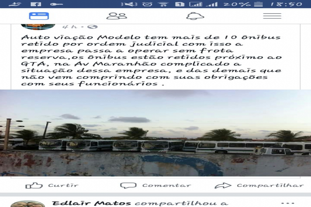 cerca de 10 veículos retidos por decisão judicial (ontem pela manhã, 01); Com isso a empresa passa a operar sem frota reserva. Os ônibus foram retidos próximos a GTA na Avenida Maranhão. Complicada a situação da empresa que está pagando todo mês o salário com atraso…”