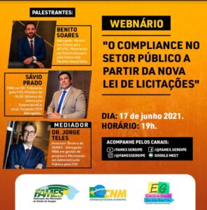 a Lei Anticorrupção, como resposta à pressão internacional e aos escândalos de corrupção envolvendo a administração pública e empresas privadas. A Lei Anticorrupção trouxe para o meio empresarial brasileiro os “programas de integridade”, isto é, regras de compliance com foco na prevenção, mitigação e contenção de riscos envolvendo atos lesivos contra a administração pública, em todos os seus níveis. Nesse cenário, quem tem um Programa de Compliance passou a exigir que seus parceiros também o tivessem. A depender do segmento de atuação, era uma imposição do mercado. Aquilo que era considerado apenas uma boa prática passou a ser agora exigência também em âmbito federal. A nova Lei de Licitações trouxe a implementação de programas de integridade como requisito para contratação de bens e serviços com a administração pública. Muitas dúvidas ainda existem em virtude das novas regras. E para tirá-las, a Federação dos Municípios de Sergipe (FAMES) promove hoje, 17, às 19h, um Webnário com o tema “O compliance no setor público a partir da nova lei de licitações”. Os palestrantes serão os advogados e especialistas em compliance Benito Soares e Sávio Prado.