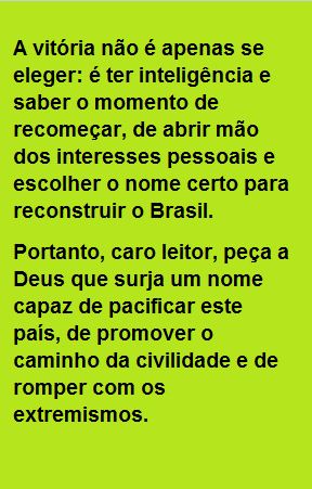 Portanto, caro leitor, peça a Deus que surja um nome capaz de pacificar este país, de promover o caminho da civilidade e de romper com os extremismos.