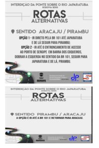 por meio do Departamento Estadual de Infraestrutura Rodoviária de Sergipe, DER, juntamente com a Defesa Civil Estadual, fez, na manhã do dia, 22, uma vistoria na ponte que fica sobre o rio Japaratuba, na rodovia SE-100, município de Pirambu, litoral Norte do Estado. Depois de avaliar a situação da ponte ficou decidido que será feita, hoje à tarde, a interdição preventiva da ponte para garantir a segurança de quem transita pelo local.Os serviços de recuperação já começam a ser feitos a partir da próxima segunda-feira, 25, e devem durar uma média de 180 dias. Serão colocadas barreiras de proteção para ninguém passar pela ponte, nem pedestres. A interdição tem o apoio da Prefeitura Municipal de Pirambu.