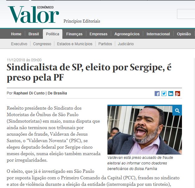 Com o título “Sindicalista de SP, eleito por Sergipe, é preso pela PF” o jornal Valor Econômico de ontem publicou uma matéria do jornalista Raphael Di Cunto (Brasília) que “reeleito presidente do Sindicato dos Motoristas de Ônibus de São Paulo (Sindmotoristas) em maio, numa disputa que ainda não terminou nos tribunais por acusações de fraude, Valdevan de Jesus Santos, o “Valdevan Noventa” (PSC), se elegeu deputado federal por Sergipe cinco meses depois, numa eleição também marcada por irregularidades.”
