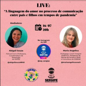 Live hoje, 16/07, às 20h “A linguagem do amor no processo de comunicação entre pais e filhos em tempos de pandemia” Hoje, 16, às 20h, o Instagram da Secretaria da Segurança Pública de Sergipe (http://www.instagram.com/ssp_sergipe ) transmitirá uma live com o tema “A linguagem do amor no processo de comunicação entre pais e filhos em tempos de pandemia”. A live será conduzida pela policial civil e professora Abigail Souza, coordenadora de Prevenção da SSP/SE. A convidada para debater o assunto é a pedagoga e coach Maria Angélica Costa. Tema atual e imperdível, principalmente para mães, pais e educadores.