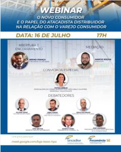 (Sincadise) realiza nesta quinta-feira (16) um debate, por meio de transmissão online, para os empresários do comércio atacadista, distribuidor e varejista, com a participação da palestrante Fátima Merlin, de São Paulo, e representantes do segmento empresarial sergipano. Com o tema “O novo consumidor e o papel do atacadista dristibuidor na relação com o varejo consumidor”, o webinar trará informações sobre o comportamento do consumidor diante do cenário de pandemia e o que se pode esperar para o futuro. O webinar será realizado pelo Google Meet e transmitido pelos canais de comunicação do Sincadise, com apoio da Fecomércio. Participarão do evento o presidente do sindicato, Breno França, o vice-presidente da ABAD, Juliano César, o empresário Fábio Júnior, o superintendente do Sebrae, Paulo do Eirado, o presidente da Acadeal de Alagoas, Zezinho Vieira, o presidente da Ases, José Anderson e o gerente de distribuição do Lojão Fasouto, José Anilton. O debate será mediado pelo jornalista Marcio Rocha. Para participar: https://meet.google.com/bgs-kaax-hpo