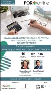 economia está se reorganizando e há muitas oportunidades de compra ou fusão entre empresas. Para analisar o cenário e as oportunidades de negócios, a Tognetti Advocacia realizará um webinar sobre operações de M&A e como equacionar o passivo tributário. Silvania Tognetti, doutora em direito econômico e sócia do Tognetti Advocacia recebe Marcell Portugal, sócio da JK Capital, hoje, 16 de julho, às 10h (horário de Brasília) e 14h (horário de Portugal). É necessário fazer a inscrição para ter acesso à plataforma de transmissão da Câmara Portuguesa de Comércio de S.Paulo, organizadora do evento: https://camaraportuguesa.com.br/conteudo.asp?pag=evento_socio&id_evento=19338