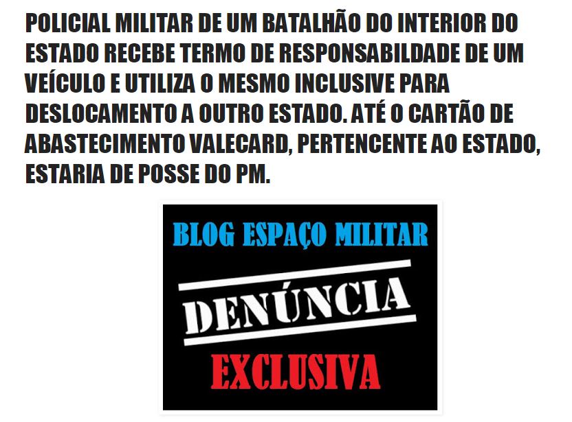 O blog Espaço Militar tomou conhecimento de que um policial militar de um determinado batalhão do interior do estado, teria recebido um termo de responsabilidade de um veículo, cuja placa, identificação e matrícula é do conhecimento deste blog, fazendo uso do veículo, inclusive para seu deslocamento a outro estado, estando inclusive o PM de posse do cartão de abastecimento ValeCard, pertencente ao estado. Não se pode permitir a utilização de um patrimônio móvel do estado em proveito próprio, inclusive para transporte particular para outro estado.