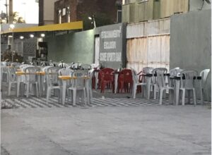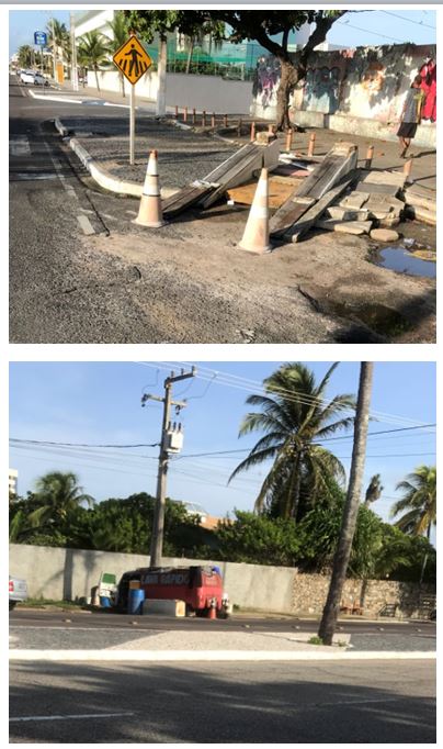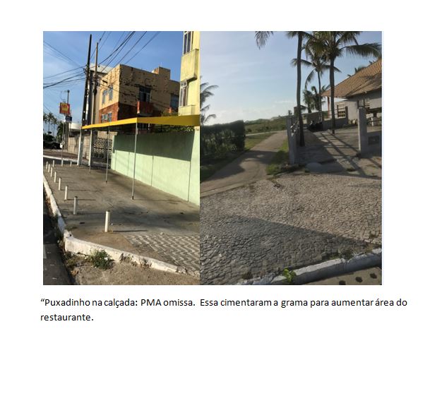 A primeira foto é de um puxadinho que no final da tarde coloca mesas e cadeiras na calçada. Está bem próximo ao Ibis Hotel. Lá tinha um bar ao lado do puxadinho que fechou porque não dá pra concorrer com um informal que não paga aluguel, luz, água, impostos e não assina Carteira de Trabalho. A segunda foto é de um restaurante que o proprietário cimentou a grama da Orla pra aumentar a área do restaurante. Já a foto ao lado é do mesmo puxadinho já com as mesas e cadeiras instaladas em toda a calçada.