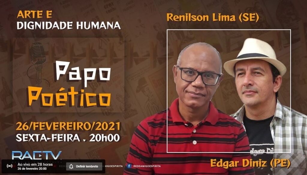 Papo Poético: nesta sexta-feira, 26, às 20h Eita que Renilson Lima está animado com a estreia do Programa Papo Poético. Ele deixou gravado um recadinho para todos nós. Querem saber as novidades? Então assista abaixo o vídeo que foi feito com muito carinho. Link do programa https://youtu.be/EwtOXNreAhg O convidado do programa é Edgar Ferreira Diniz Junior, Poeta, Cordelista e Professor na escola estadual Guedes Alcoforado com aulas de História, sociologia, filosofia e Cordel. Natural de Patos na Paraíba. Há 20 anos radicado em Pernambuco, Brasil. Licenciado em História com pós-graduação (Lato sensu) em História do Nordeste. Desde 2006 atua na área da educação com aulas de Literatura de Cordel, com o projeto EDUCANDO EM CORDEL que visa as escolas, a arte da poesia e a possibilidade de utilizá-la como forma pedagógica.