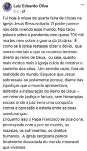 E viralizou nas redes sociais e nos grupos de WhatsApp de Sergipe um texto publicado no Facebook do advogado, professor, poeta, articulista e membro da Academia Sergipana de Letras Jurídicas Luiz Eduardo Oliva. Segundo o autor da postagem, que teria participado da missa da quarta-feira de cinzas na Igreja Jesus Ressuscitado, cujo pároco é o famoso vigário-geral da arquidiocese de Aracaju, pe. Genário, mais conhecido como o chefinho sonso, “a Igreja sergipana parece totalmente dissociada do mundo miserável que vivemos.” Misericórdia. Leia na íntegra a postagem publicada conforme a conta do Facebook de Luiz Eduardo Oliva: https://www.facebook.com/100026262014101/posts/944829663069092/?d=n