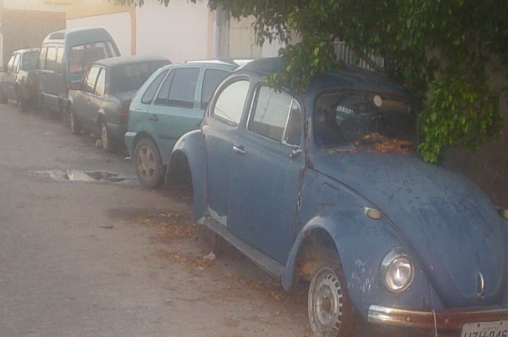 Carros velhos estão parados há muito tempo ocupando parte da calçada. |