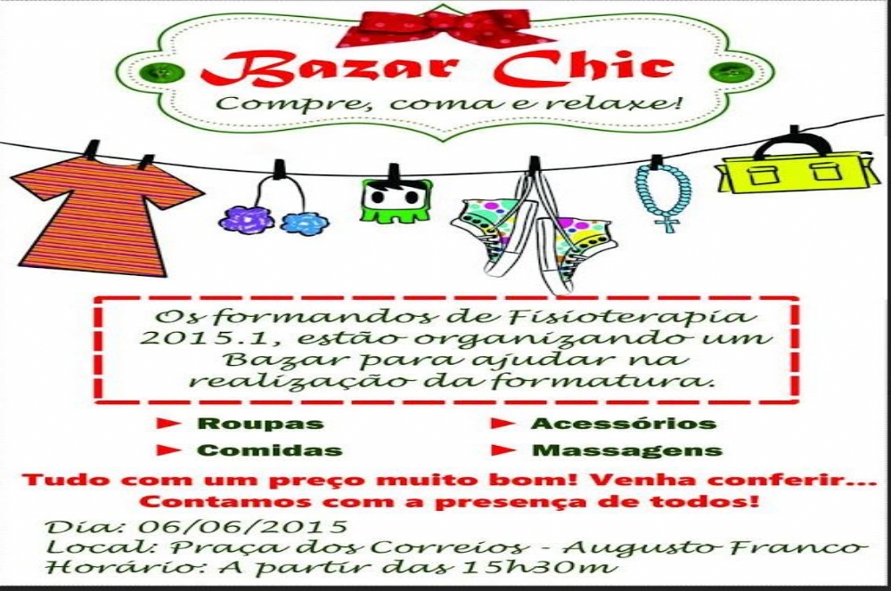 Um programa para toda família neste sábado, 06, na Praça dos Correios, no conjunto Augusto Franco: O Bazar Chic, da turma de formandos de Fisioterapia 2015.1 da Unit. A partir das 15h30 você poderá adquirir roupas e acessórios. Além de uma massagem relaxante e comidas deliciosas. O bazar é para ajudar na formatura da turma. Vale à pena!
