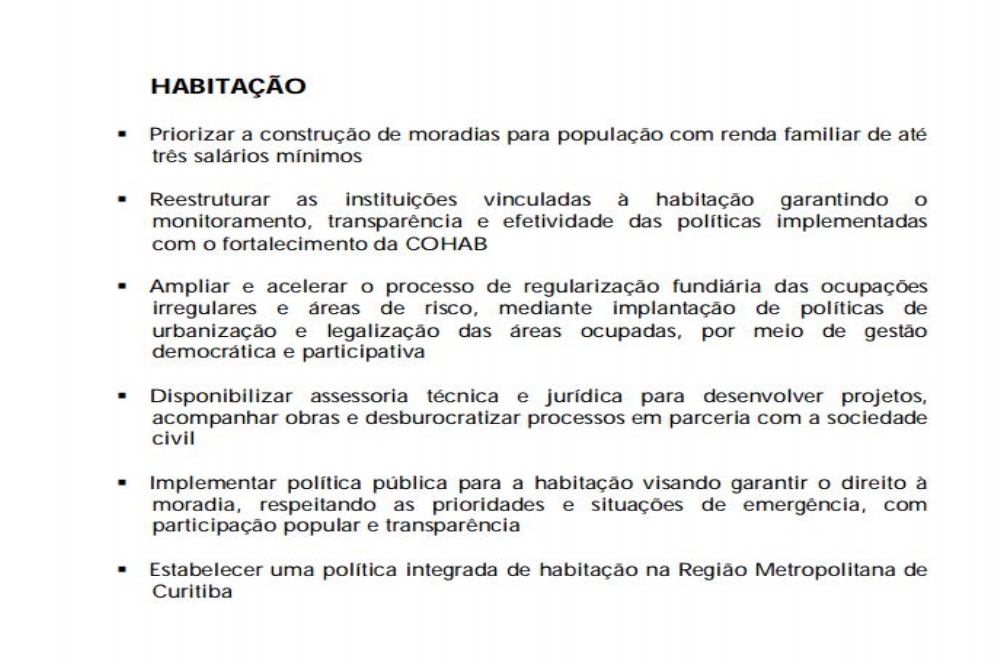 Além da parte de mobilidade e acessibilidade urbana, abastecimento (Segurança alimentar e nutricional), cultura, desenvolvimento econômico, educação, esporte e lazer, Gestão Pública, habitação, meio ambiente, mulheres, planejamento urbano, saúde e turismo. Quase todas copiadas vírgula por vírgula.Até o meio ambiente que tem um técnico competente, como Eduardo Matos, foi todo copiado. O plano de Gustavo Fruet de 2012: http://salamuni.com.br/site/imagens/propostagustavo.pdf