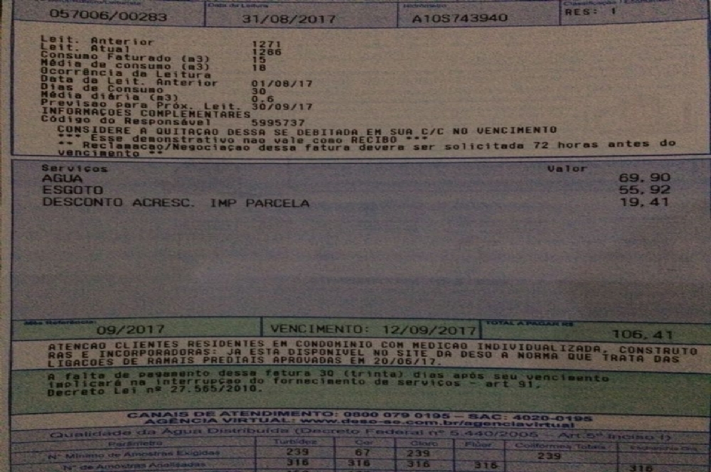 | Conta da Deso recebida por um morador de condominio. |