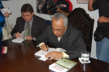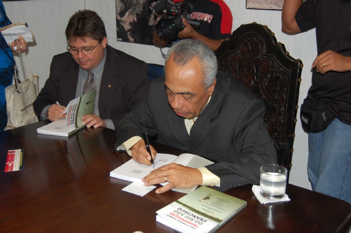 | João Alves dá autografos ao lado do colaborador Eduardo Lima | O ex-governador João Alves Filho lançou na noite dessa terça-feira, 28, o livro 'Toda a Verdade Sobre a Transposição do Rio São Francisco', do qual ele foi é organizador. A obra é uma reunião de textos de escritores das mais variadas áreas, a exemplo de juristas e ambientalistas. Na ocasião do lançamento, que foi realizado na livraria Escariz do Shopping Jardins, várias autoridades de diversas áreas fizeram fila para comprar e ter seu livro autografado pelo ex-governador e dois autores de textos presentes na obra, o promotor Eduardo Lima de Matos e Manoel Bomfim.