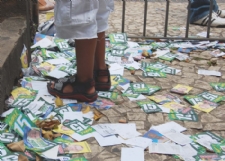 | Material de campanha se acumula nas ruas | Muitos santinhos, programas, adesivos, cartazes e todo o tipo de propaganda eleitoral já se acumulam nas ruas de Aracaju. Os eleitores reclamam da quantidade de lixo e da falta de educação das pessoas. “Acho isso uma porqueira”, afirma a eleitora Luzia Almeida, referindo-se à grande quantidade de papéis espalhados em frente ao Colégio Atheneu Sergipense na manhã deste domingo, 5.