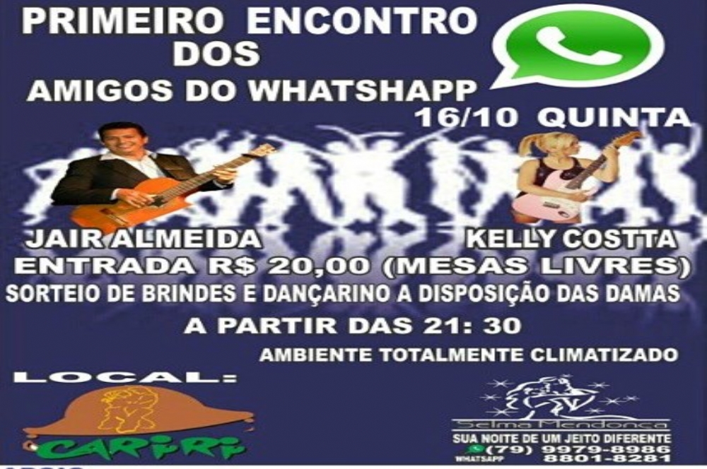 O 1° Encontro dos Amigos do Whatsapp acontece nesta quinta-feira, 16, a partir das 21h30, na Casa de Forró Cariri. Jair Almeida e Kelly Costa comandam a festa que dançarinos à disposição das damas e sorteio de brindes. Ingressos custam R$ 20. Informações através do telefone (79) 9979 8986.
