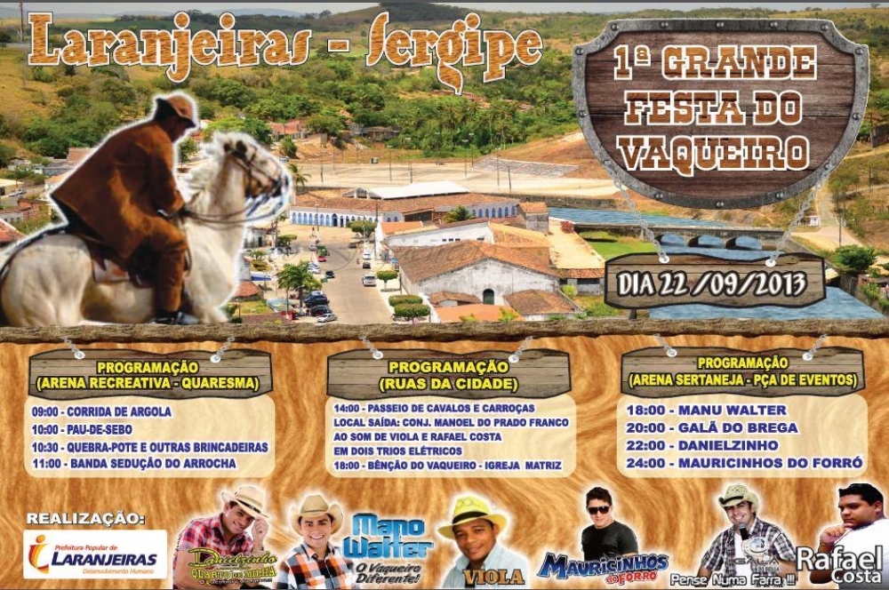 A Prefeitura de Laranjeiras, através da Secretaria Municipal de Cultura vai realizar no próximo dia 22, a 1ª grande Festa do Vaqueiro. A programação terá início às 9h, com a tradicional Corrida de Argolas e seguirá até a madrugada com a apresentação de bandas e cantores já conhecidos do público, como Danielzinho, Mauricinhos do Forró, Manu Walter, entre outros.