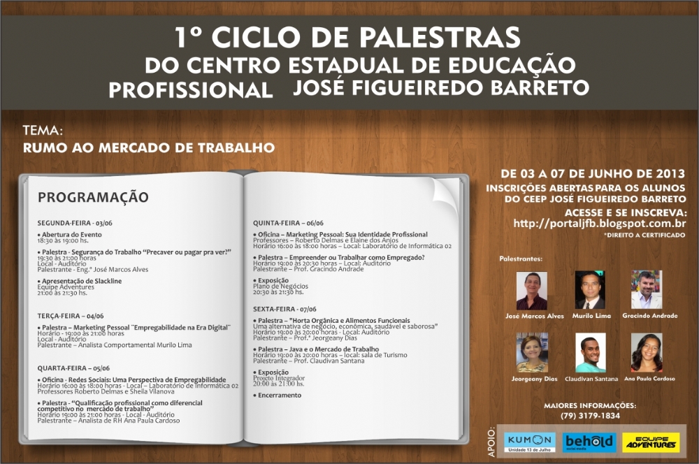 O 1º Ciclo de Palestras do Centro Estadual de Educação Profissional José Figueiredo Barreto ocorre até o dia 7 de junho. A entrada é franca e as inscrições para o público externo já estão abertas e podem ser feitas através do http://portaljfb.blogspot.com.br/