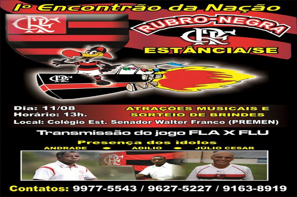 O 1º Encontrão da Nação Rubro-Negra em Estância acontecerá a partir das 13h, no PREMEN (Colégio Estadual Senador Walter Franco), será animado pela Banda de Samba e acontece no mesmo dia do clássico FLA X FLU, que será transmitido ao vivo para todos os torcedores do mais querido.