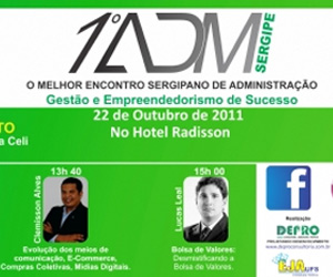 A palestra de abertura será realizada pelo presidente da Construtora Celi, Luciano Barreto e durante o evento serão debatidos temas como negócios e utilidaede, comportamento, renovação, comunicação e mídias digitais, entre outros. Para mais informações, acessar os sites www.ejaufs.com.br / www.admse2011.blogspot.com , os contatos também podem ser feitos pelos emails contato@deproconsultoria.com.br e deproconsultoria@hotmail.com .