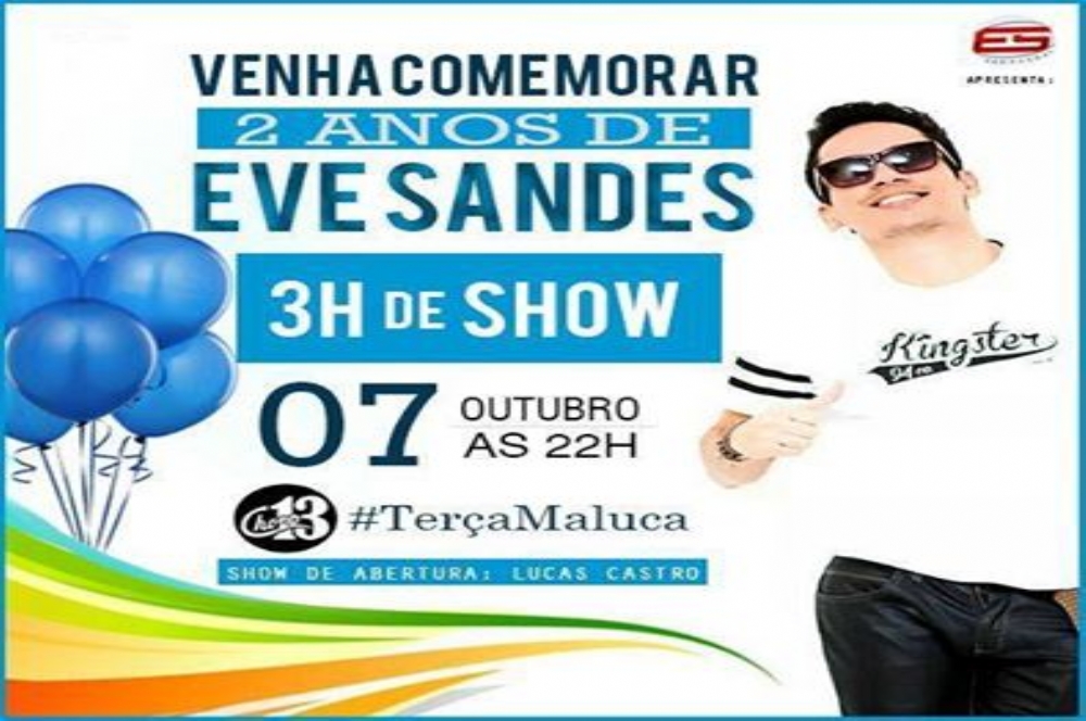 O cantor Eve Sandes comemora nesta terça-feira, 7, dois anos de carreira solo. E para marcar a data tão especial, o artista fará um super show na Terça Maluca do Chopp 13 com a participação do cantor Lucas Castro.